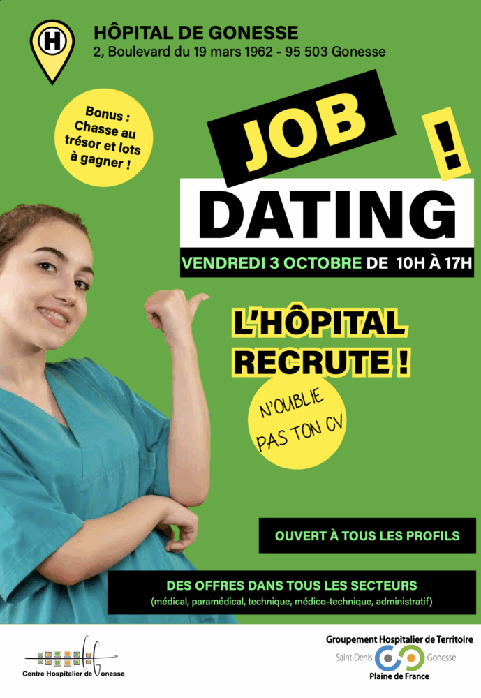 Le centre hospitalier de Gonesse organise un JobDating le vendredi 3 octobre de 10h à 17h. Un évènement destiné à faire découvrir les nombreux métiers exercés dans un hôpital et de présenter aux visiteurs l’ensemble des postes à pouvoir.